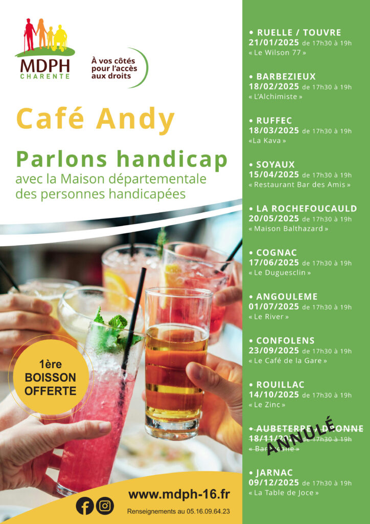 Afin d’aller au plus près des Charentaises et Charentais, la MDPH organise les Cafés Andy. Ceux-ci s’adressent à toute personne en situation de handicap ou son aidant. Conviviaux et ancrés dans la vie locale, ils se déroulent dans des cafés, restaurants ou tiers-lieux.