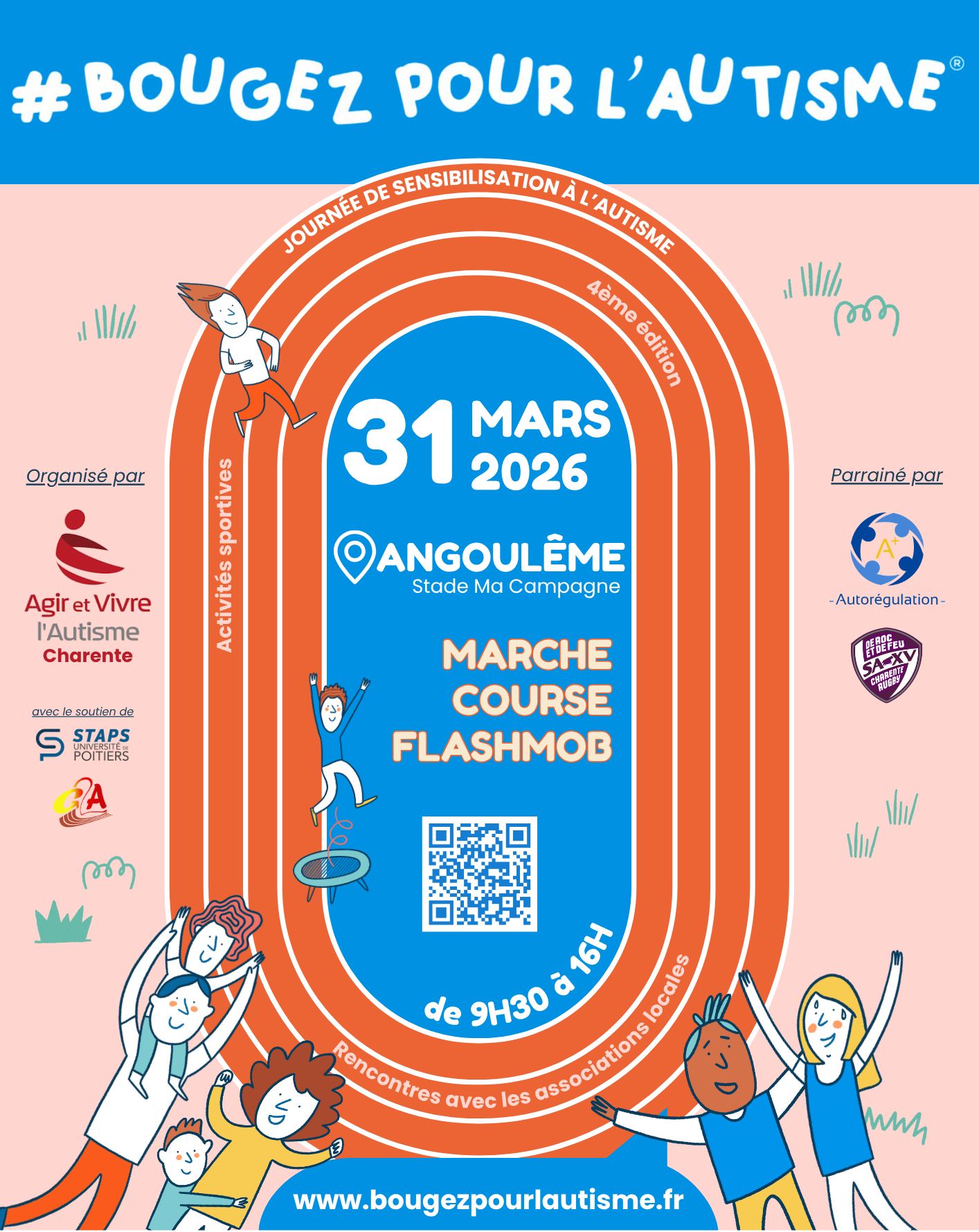 L'IME Agir et Vivre l'Autisme d'Angoulême en partenariat avec le Grand Angoulême Athlétisme (G2A) et la filière STAPS de la faculté d'Angoulême se mobilise pour une 4ème édition exceptionnelle de la Journée mondiale de sensibilisation à l'autisme le : Mardi 31 mars 2026 de 09h30 à 16h00 au grand stade d'athlétisme d'Angoulême - 11 boulevard Jean Moulin (Ma Campagne) Course, marche, flashmob, activités physique, rencontres avec les associations locales. Informations et inscriptions : https://in.njuko.com/jmsa-2026