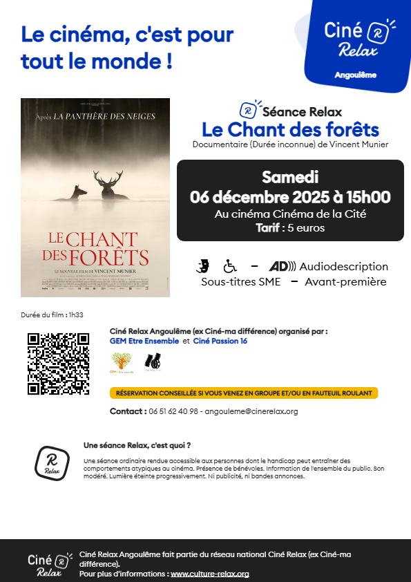 Les séances Ciné Relax proposent un environnement bienveillant et chaleureux où chacun, avec ou sans handicap, est accueilli et respecté tel qu’il est. Présence de bénévoles. Information à l'ensemble du public. Son modéré. Lumière éteinte progressivement. Ni publicités, ni bandes annonces. Réservation conseillée si vous êtes en groupe et/ou en fauteuil roulant. Contact : 06 51 62 40 98 - angouleme@cinerelax.org   LE CHANT DES FORETS Documentaire (Durée inconnue) de Vincent Munier Après La Panthère des neiges, Vincent Munier nous invite au coeur des forêts des Vosges. C’est ici qu’il a tout appris grâce à son père Michel, naturaliste, ayant passé sa vie à l’affut dans les bois. Il est l’heure pour eux de transmettre ce savoir à Simon, le fils de Vincent. Trois regards, trois générations, une même fascination pour la vie sauvage. Nous découvrirons avec eux cerfs, oiseaux rares, renards et lynx… et parfois, le battement d’ailes d’un animal légendaire : le Grand Tétras.